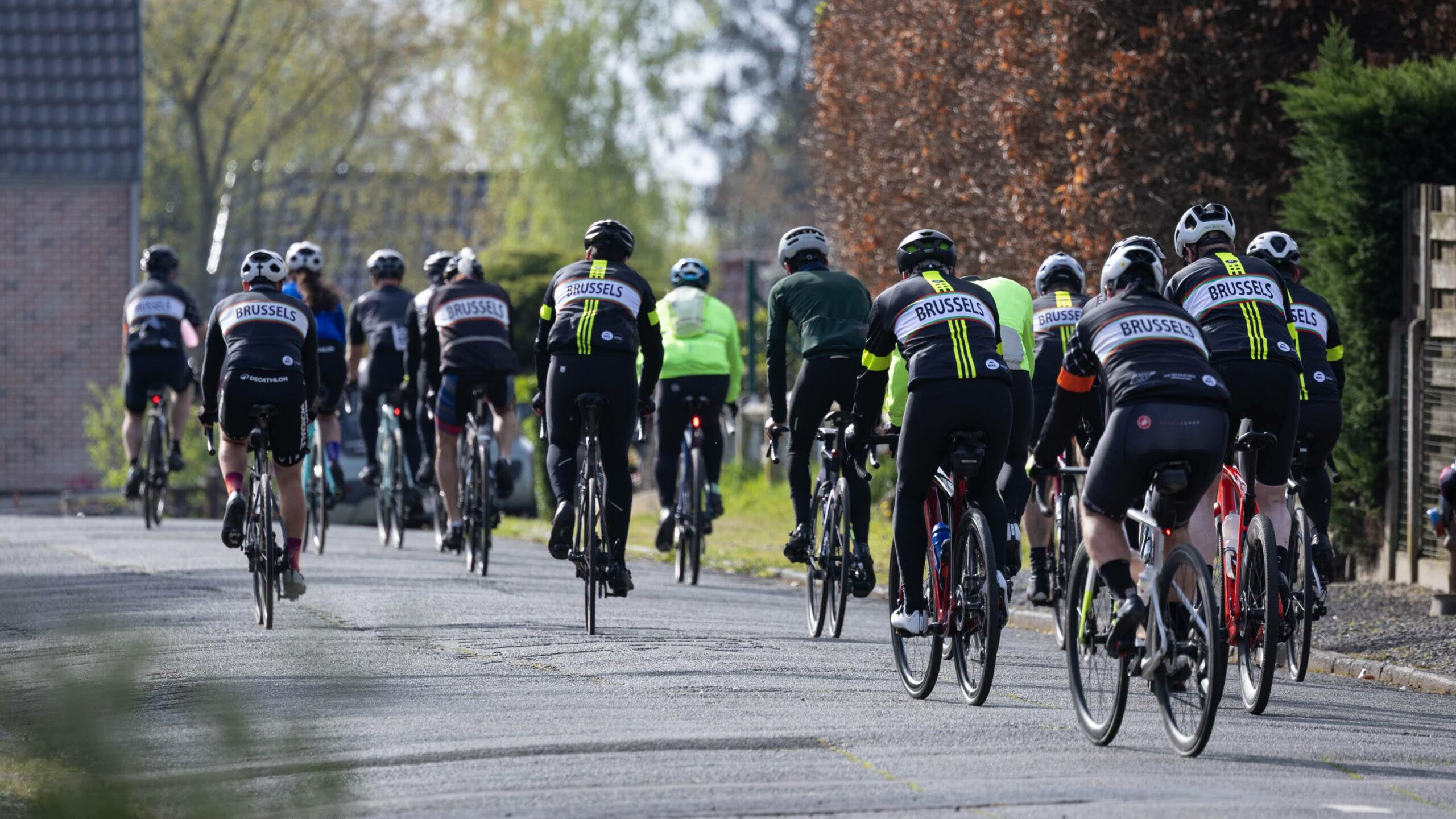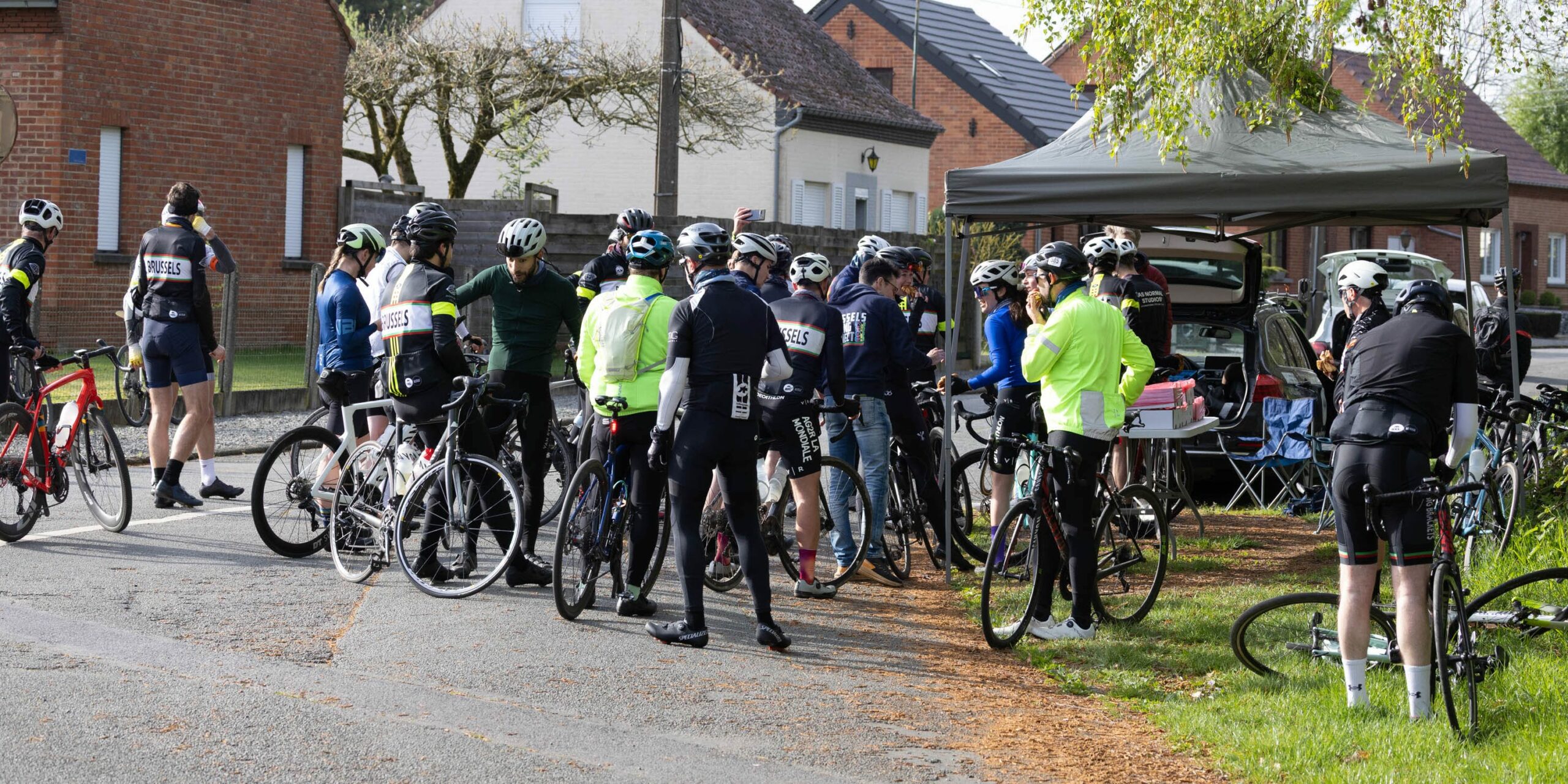As on every Sunday, the meetup point was the kiosk in the Bois de la Cambre. With riders from across the full spectrum of the club present, it made for a true BBB family picture: the classic black-and-white BBB jerseys mixed with the fiery colors of BCP30.